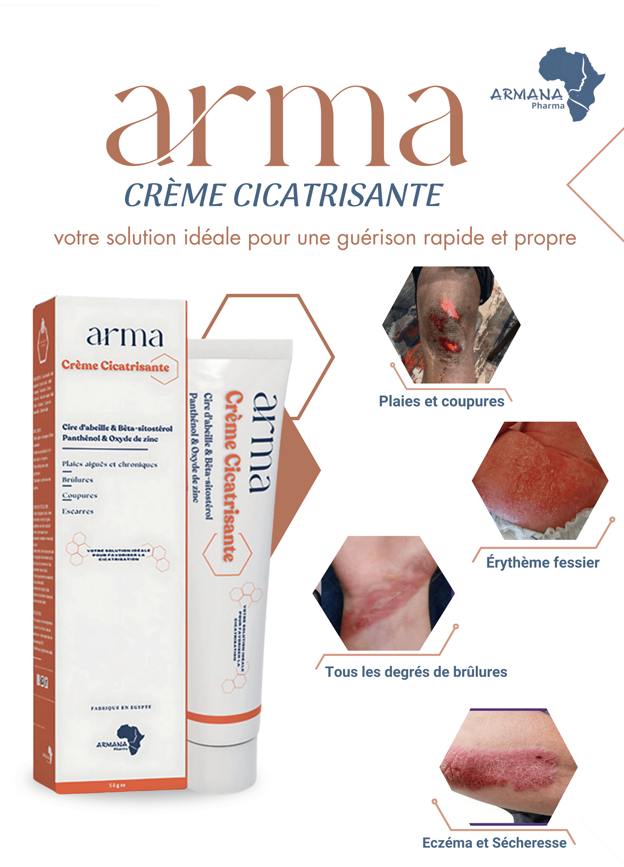 Comment utiliser arma crème cicatrisante? Appliquez la crème avec tous les types des plaies, blessures, brûlures, des points de fils à suture deux ou trois fois par jour ou selon les directives de spécialiste de santé. Il suffit d'appliquer une fine couche de crème sur la plaie et de la recouvrir d'un bandage ou d'un sparadrap. Ce produit peut être utilisé sur des plaies de petite ou de grande taille et convient également au traitement des plaies chroniques. La crème n'a pas d'effets secondaires. De plus, la crème ne colle pas à la plaie et sans parfum. Elle convient à tous les âges et peut même être utilisée pendant la grossesse et l'allaitement. Cire d’abeille : • Former une barrière respirante pour retenir l'humidité et protéger contre les irritations. Apaiser bien les blessures car il contient la vitamine A pour bien faciliter la cicatrisation. Bêta-sitostérol : • Réduire les inflammations et les démangeaisons et favoriser une guérison plus rapide. • Aider à renforcer la barrière cutanée et à réduire l'inflammation et les irritations. Panthénol et Extrait d'Aloe Vera : • Hydrater en profondeur et favoriser une régénération rapide de la peau. Oxyde de zinc : • Aider à favoriser la cicatrisation et il est idéal pour l’érythème fessier. Huile de sésame : • Aider la peau à se nourrir et à éviter la sécheresse cutanée. Huile d’olive : • Avoir des effets naturels anti-inflammatoires et protéger et hydrater la peau. Huile d’amande : • Soutenir les processus de la réparation de la peau. Chlorhexidine : • Prévenir l’infection et favoriser la guérison propre. Une Combinaison de synergie qui vous aide à avoir une guérison rapide et propre