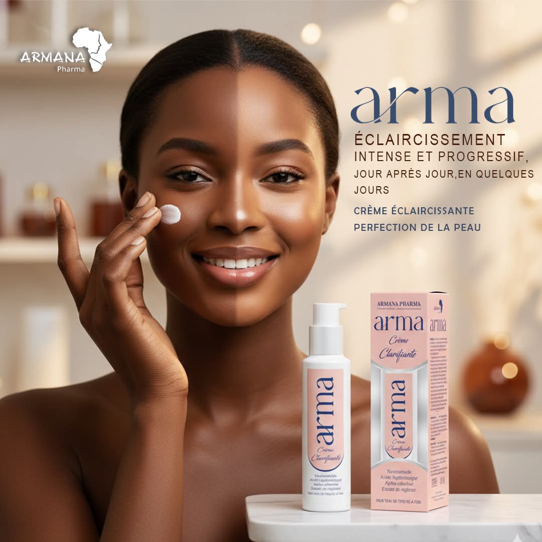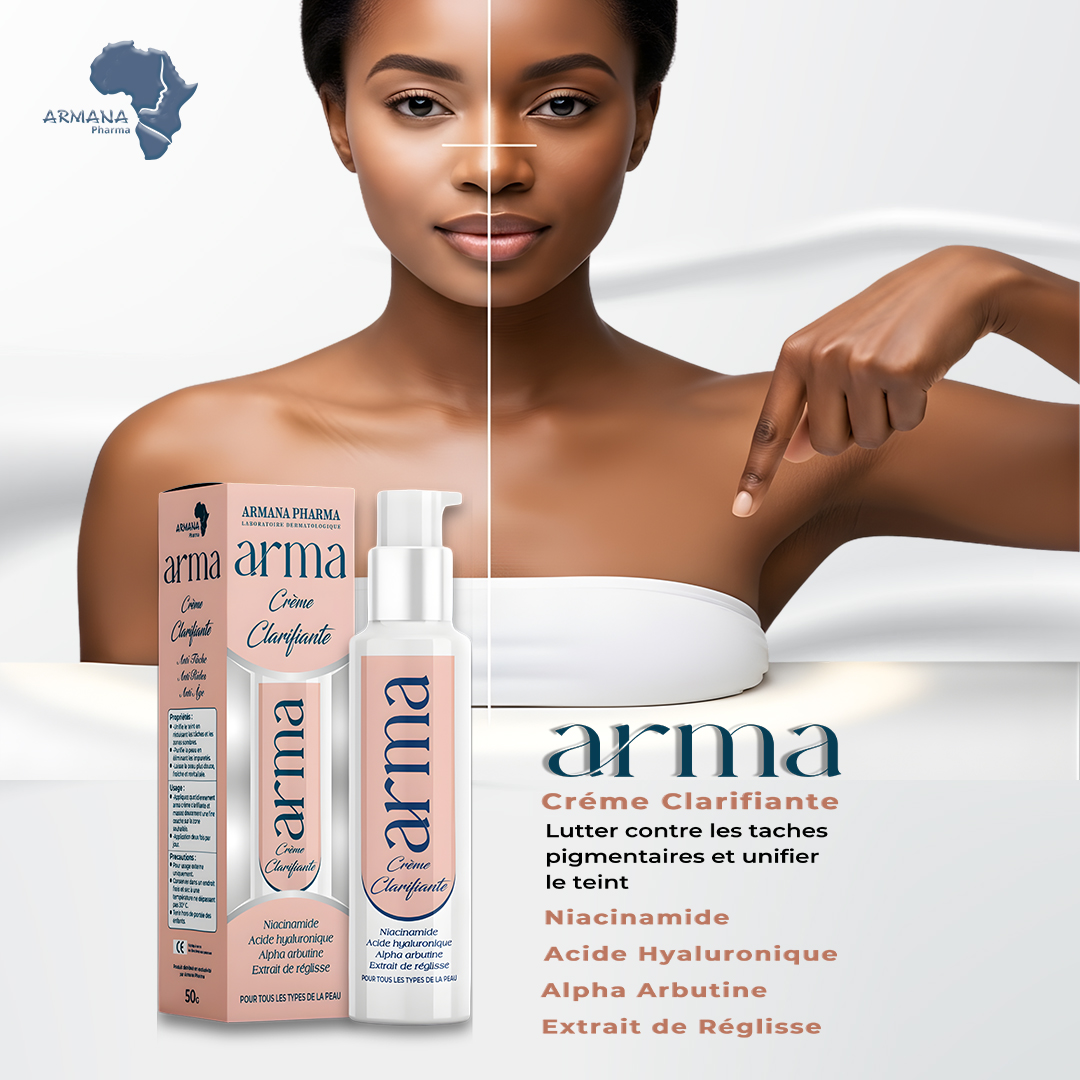 INGRÉDIENTS ACTIFS & BIENFAITS – ARMA CRÈME CLARIFIANTE Niacinamide • Aide à éclaircir le teint • Réduit les taches pigmentaires • Unifie la couleur de la peau Acide Hyaluronique • Hydratation intense et durable • Prévient la sécheresse • Rend la peau douce, souple et repulpée Alpha Arbutine • Actif puissant contre les taches brunes • Aide à estomper le mélasma et l’hyperpigmentation • Favorise un teint plus lumineux Extrait de Réglisse • Éclaircissant naturel • Apaise la peau • Réduit les rougeurs Convient à tous les types de peau